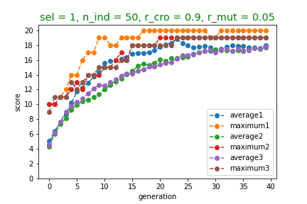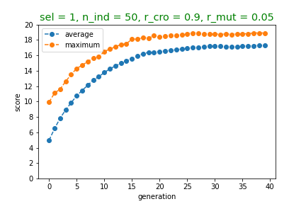와 같이 나타납니다. 최고점수 또한 증가하는 경향을 띠고 있습니다. 또한, 40번째 세대를 이루는 50개의 개체들 중에는 만점을 받는 개체가 있거나 만점에 가까운 개체가 있음을 알 수 있습니다.
