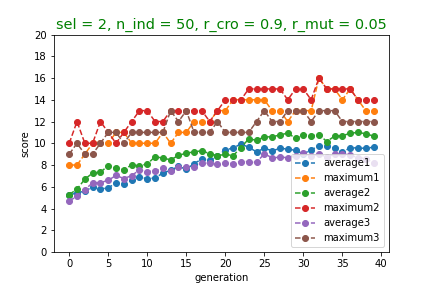 지금까지, 한 세대에 대한 genetic algorithm을 알아보았습니다. 이것을 여러 세대에 걸쳐 반복하면, 정말로 성능의 향상을 가져올 수 있을 것입니다(3.1). 그런데 이와 같은 기본모델은 여러 hyperparameter들을 꽤 임의로 설정한 것입니다. 이러한 hyperparameter들을 변경하여 더 괜찮은 성능을 낼 수 있도록 해보았습니다(3.2).